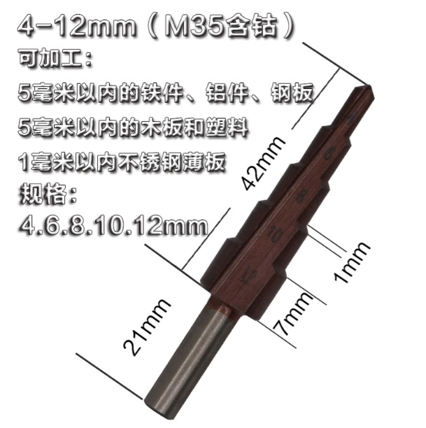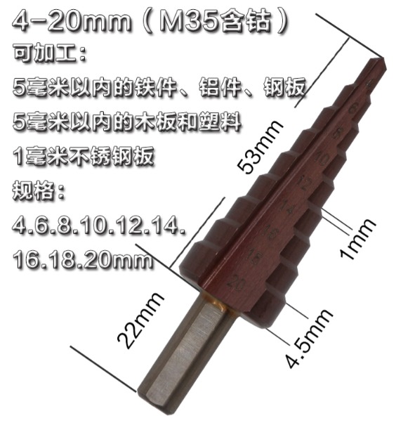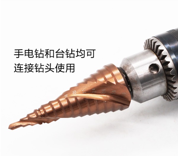 - 独特的阶梯构造,一只钻头能开多种规格尺寸孔径,一只阶梯钻抵上一盒钻头。