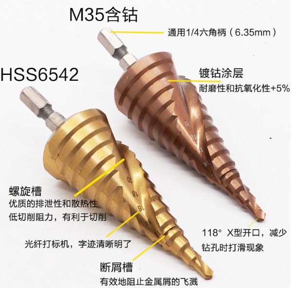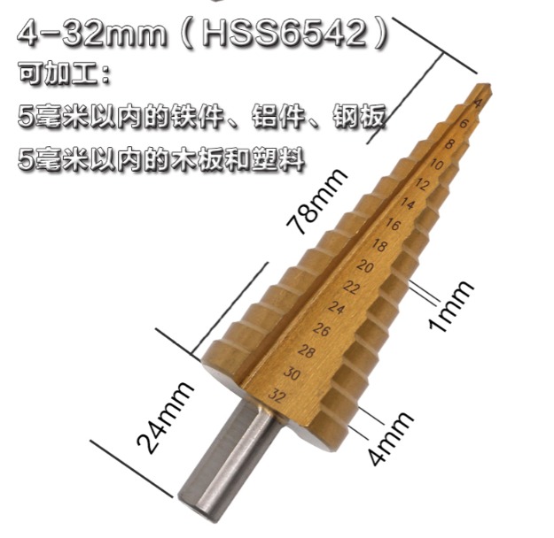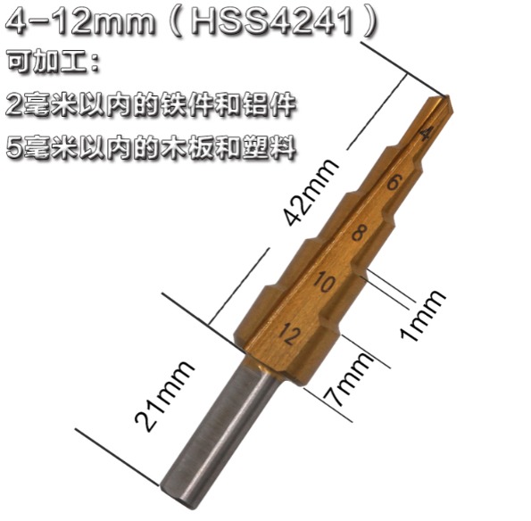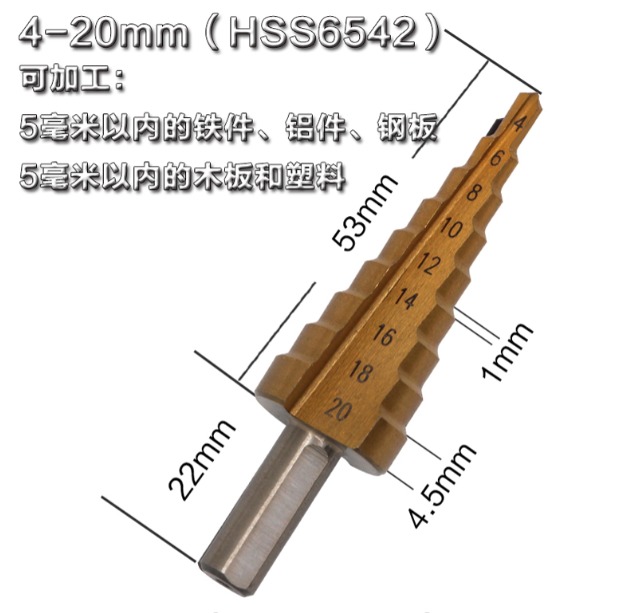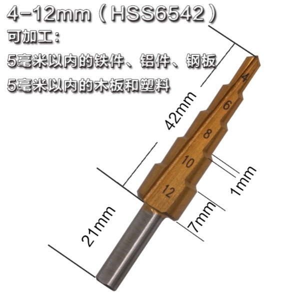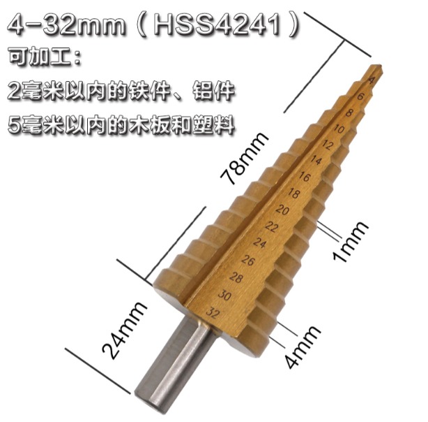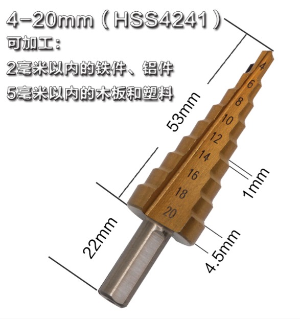 阶梯钻头也叫宝塔钻头Step Drill,用来在薄板材上开孔,优点是一个钻头能够钻出不同直径的孔,一个台阶就是一个直径;材质主要为高速钢,根据加工情况的不同可以进行表面涂层处理,用来增大钻头的使用周期。